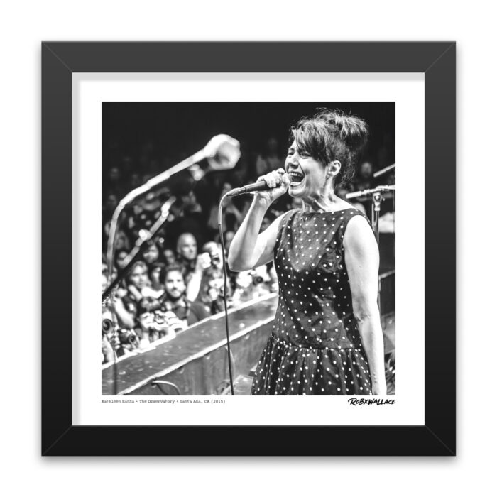 This photo captures the iconic Kathleen Hanna mid-performance with The Julie Ruin at Burger A-Go-Go on September 5, 2015, at The Observatory in Santa Ana, CA. I shot this from the stage, standing just feet away as Kathleen delivered a powerful and unfiltered performance that had the entire crowd hanging on her every word. Dressed in her classic black polka dot dress and sporting her signature beehive hairstyle, she embodied the fierce energy and unapologetic spirit that have made her a punk and feminist icon.