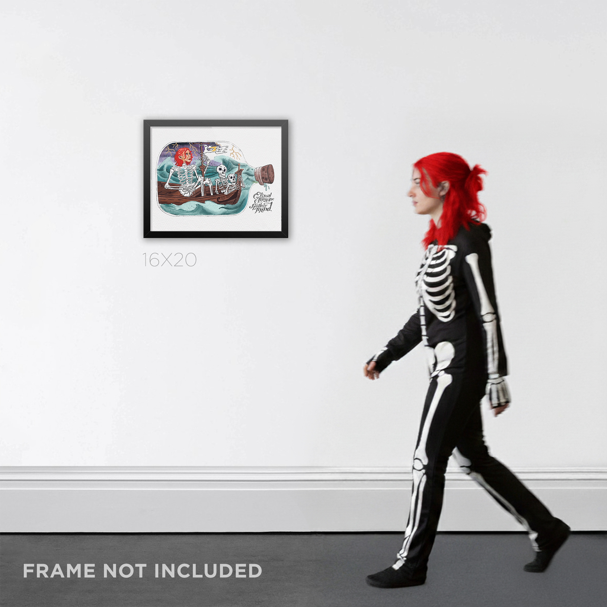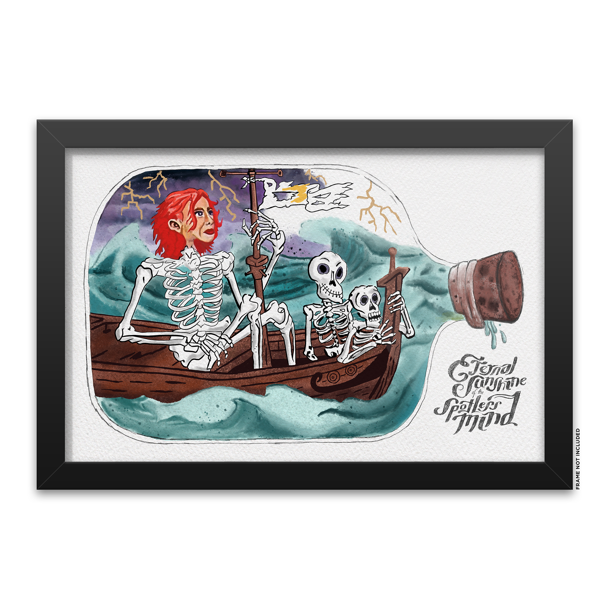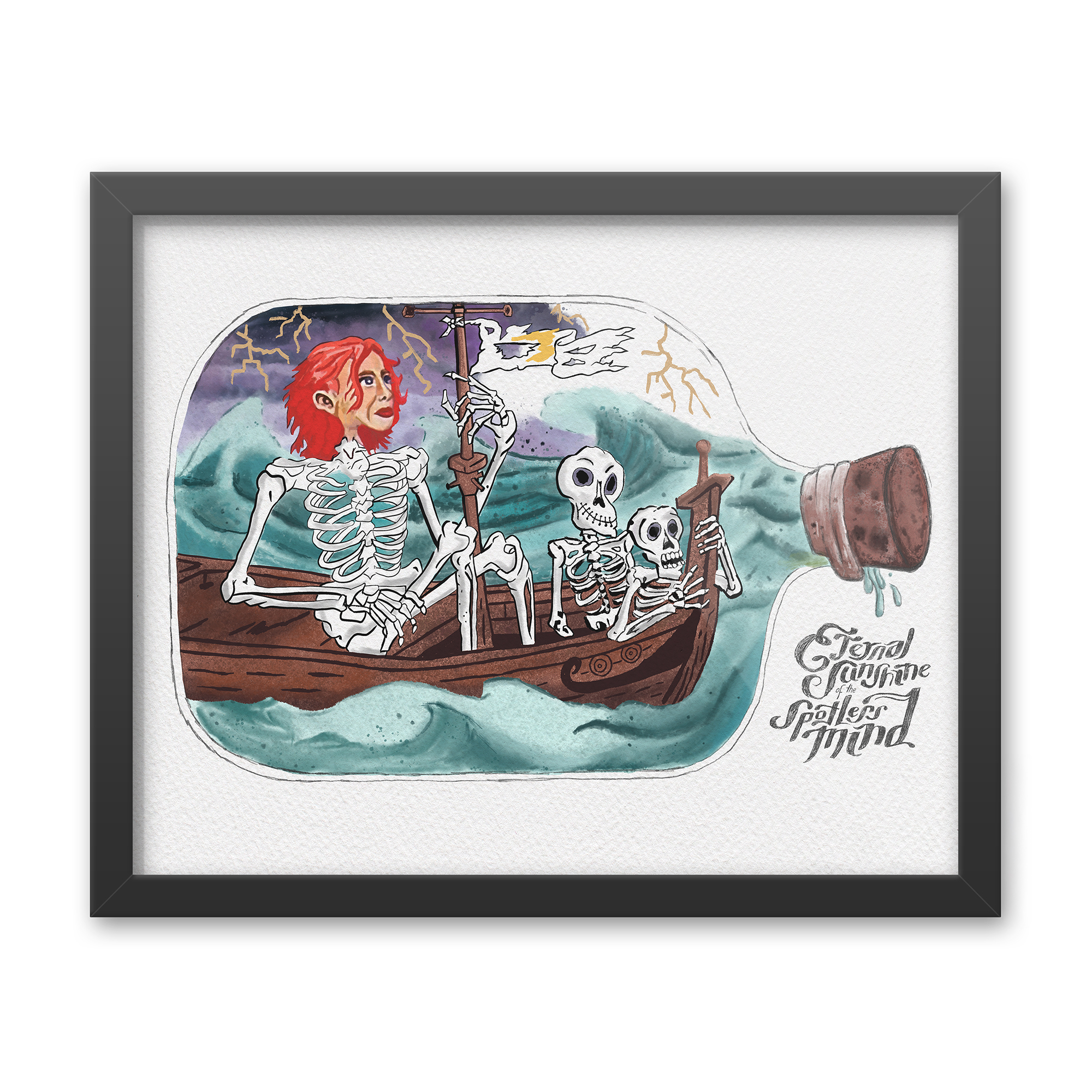 This piece is a stunning replica of the painting Joel created of Clementine in Eternal Sunshine of the Spotless Mind. Fans of the film will remember this illustration vividly—it’s one of the personal items Joel brings into Lacuna, Inc. to have erased from his memory after their heartbreaking breakup. The painting, like Clementine herself, is quirky, vibrant, and unforgettable, capturing her fiery red hair and her free-spirited essence in a skeletal, surreal style.