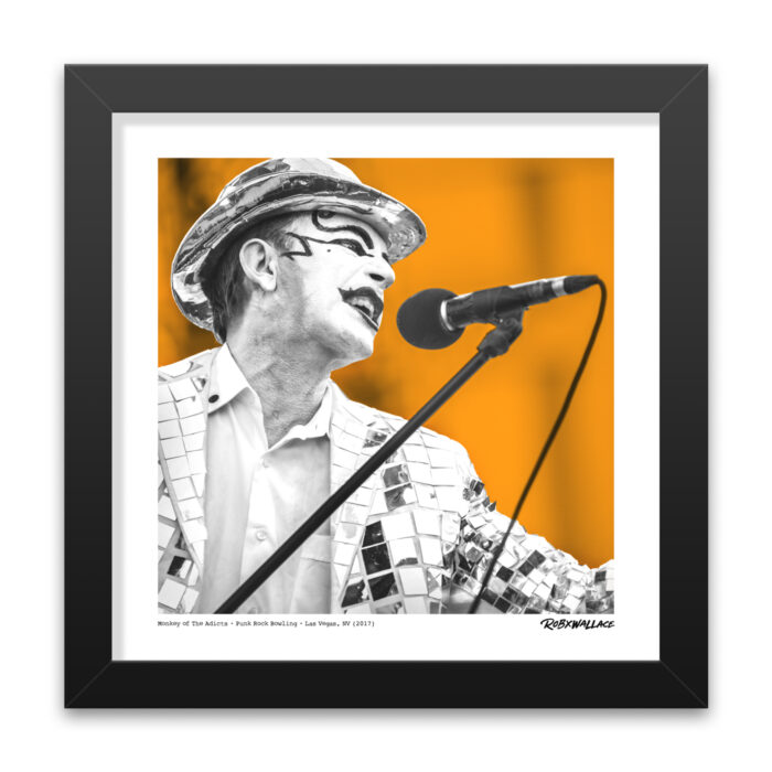 This shot of Keith “Monkey” Warren, frontman of The Adicts, was taken during their unforgettable performance at Punk Rock Bowling in Las Vegas on May 29, 2017. Dressed in his signature bowler hat, joker makeup, and sparkling mirrored suit, Monkey was the ultimate showman, bringing energy and mischief to every second of their set. The bright orange tint in the photo feels like a reflection of his electrifying presence—bold, chaotic, and impossible to ignore.